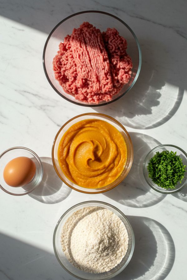In a large mixing bowl, combine the ground beef, canned pumpkin, chopped parsley, egg, and ground oats.
