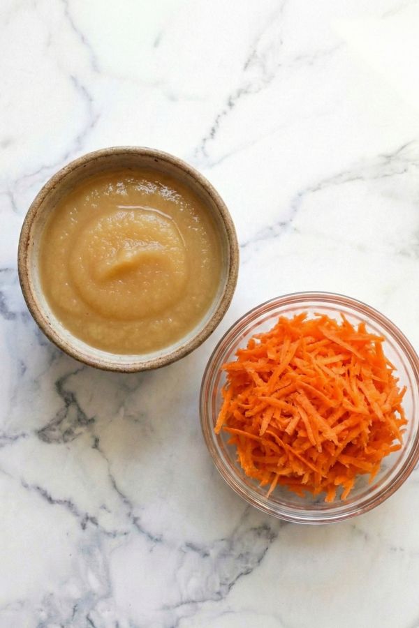 - Mix applesauce and shredded carrots.