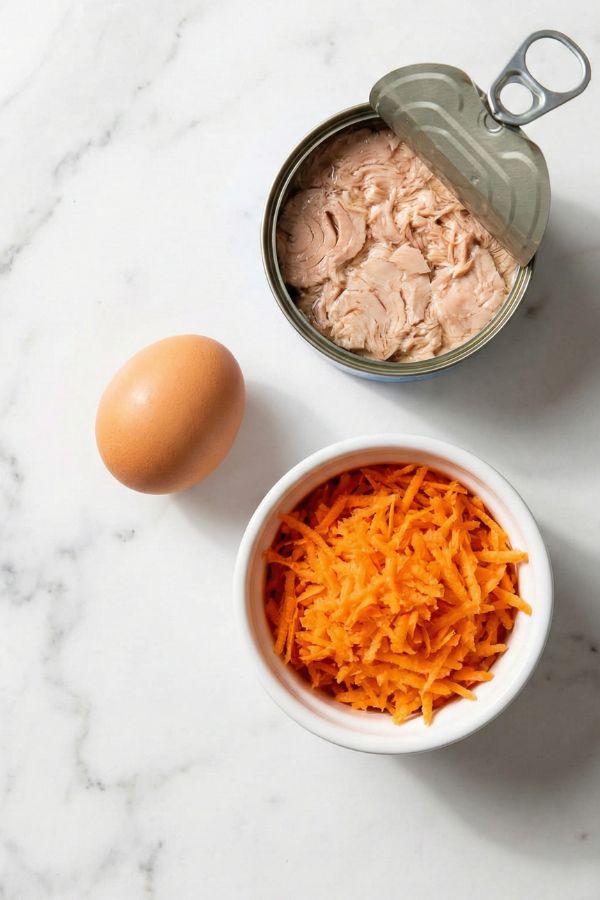 - In a small bowl, mix the drained tuna, egg, and grated carrots until everything is well combined.
