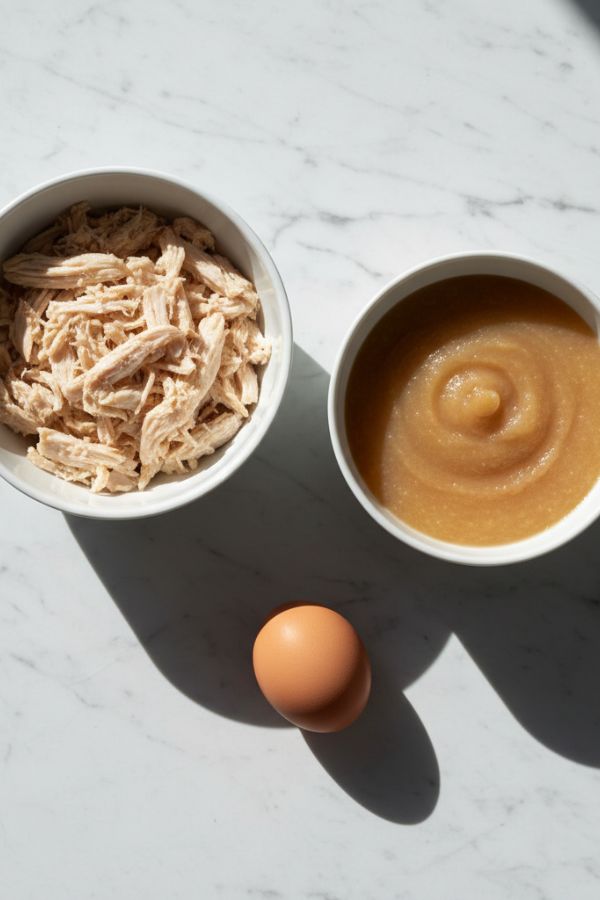 - In a bowl, combine the shredded chicken, applesauce, and the half egg (or substitute). Mix until well incorporated, ensuring everything is evenly distributed. If the mixture feels too dry, add a little more applesauce to reach a dough-like consistency.