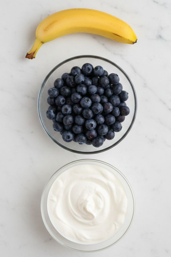 Grab your 1 banana (ripe, brown-spotted for sweetness) and ½ cup berries (blueberries or strawberries, fresh or frozen). Peel the banana and slice into chunks. If using fresh berries, rinse and pat dry. If frozen, let them thaw slightly for easier blending. Place both in a blender or food processor with ½ cup plain Greek yogurt (unsweetened, no additives).